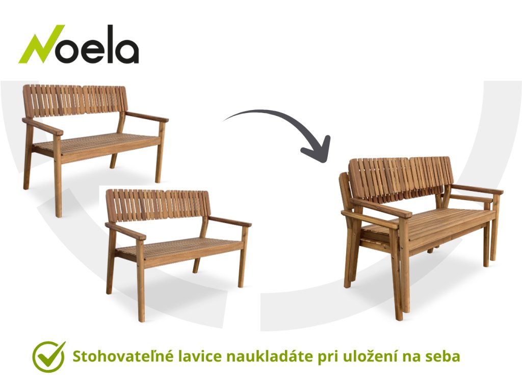 Poslednou časťou zostavy je drevená lavička LUCY z akácie. Vaše pohodlie zaistí komfortný sedák s rozmermi 46 x 109 cm a pevné drevené podrúčky. Drevený sedák poskytne dostatok miesta na sedenie pre 2 osoby. Pokiaľ plánujete kúpiť viac ako jeden kus, určite oceníte, že lavice je možné stohovať. Nosnosť lavice je 160 kg.