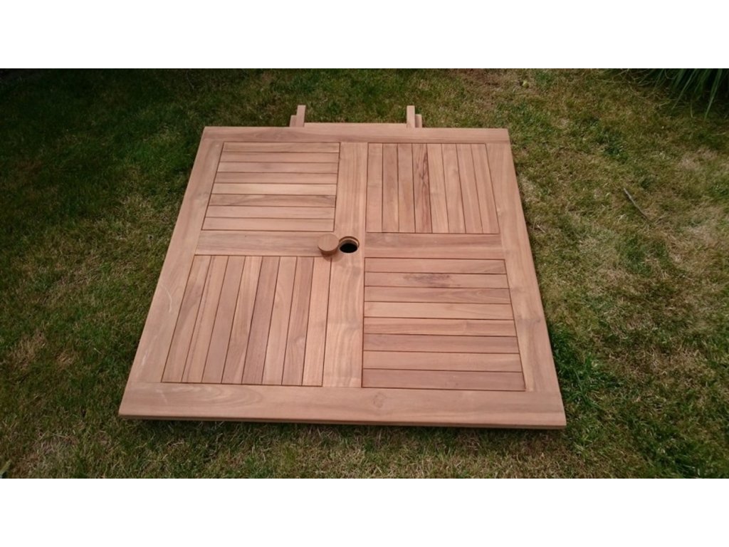 Hrúbka materiálu (vrchná časť x noha) 2,7 cm x 2,7 cm. Otvor s priemerom 5 cm na slnečník.