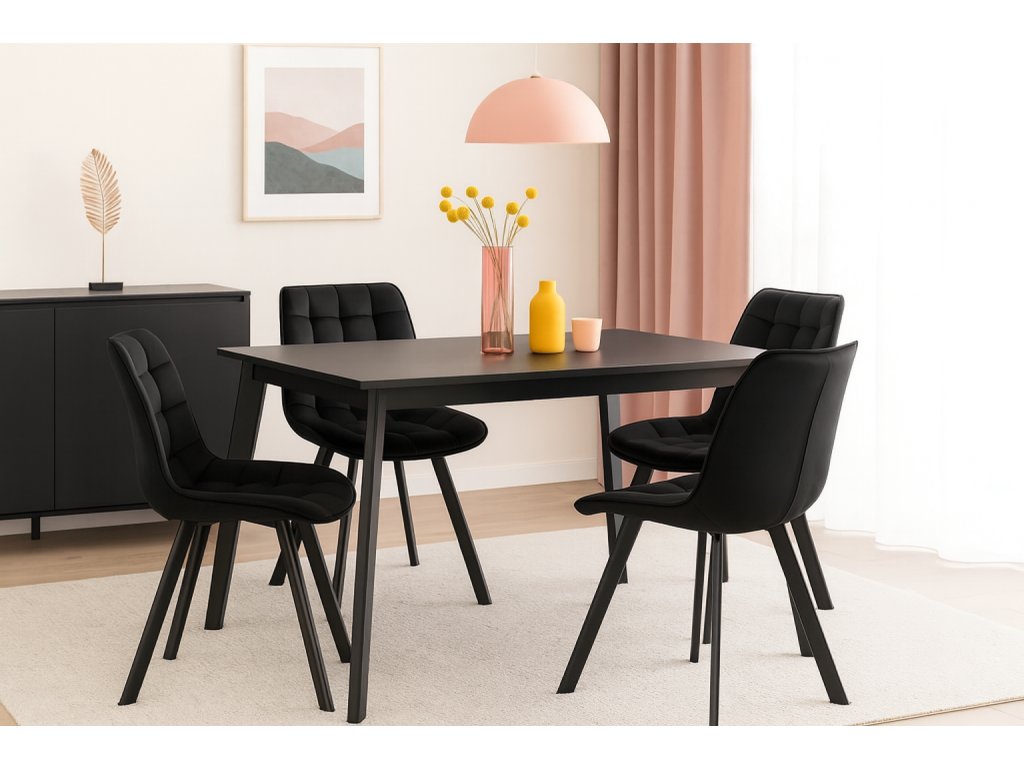 Jedálenská stolička Bella v čiernom zamate ponúka kombináciu pohodlia a striedmeho dizajnu, ktorý v interiéri pôsobí pokojne a elegantne. Zamatová látka je mäkká na dotyk a v kombinácii s prešívaním sedadla vytvára príjemný vizuálny aj praktický dojem. Jej nosnosť je až 120 kg.